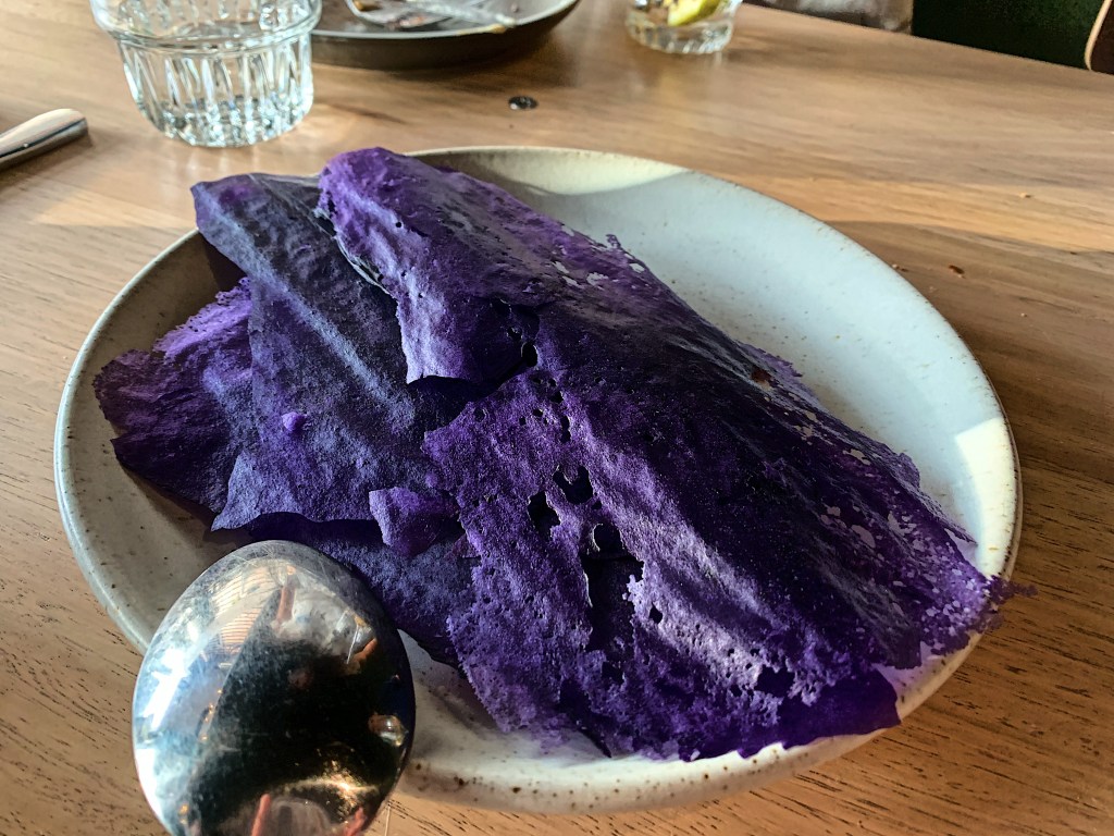 The cured spotted trevally, gribiche and purple congo wafer ($19) was perhaps the most visually arresting dish we had. Paper thin wafers of purple congo potato – presumably used solely for its colouring – obscured a heap of cured diced trevally laced with gribiche, a French mayonnaise-style sauce emulsified with hard-boiled egg yolks. Faye’s gribiche was made with yoghurt and mustard, which punctuated the fish with a pleasant tang and dill was scattered throughout, which I loved, but which Resident Photographer and Glu-Ten Things I Hate About You found a touch too overpowering. We each used our purple wafers to scoop up the trevally, making this a highly tactile dish.