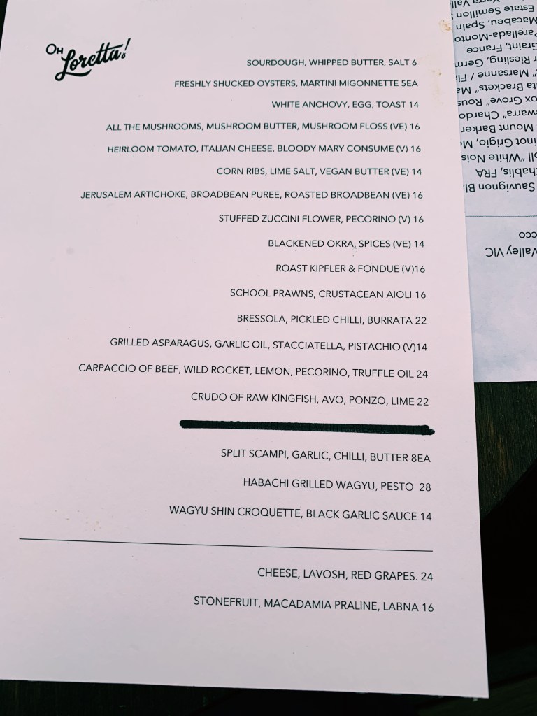 Oh Loretta! opened several months before the pandemic, but I must’ve been one of the few who live inner north to have not heard of it, judging from the multiple diners squashed into its bustling, deejayed confines. Where Vex was light, well spaced-out and refined, Oh Loretta! was warm, compact and loud – observations that could be extrapolated to their food. We showed up at 8.30pm for our late sitting, but were told we’d have to take a temporary seat in their courtyard because the previous diners hadn’t finished their dinner yet. It was a lovely, gradually cooling summer’s day and we took no issue with that, but Oh Loretta! very generously gifted us the first bottle of wine we ordered (my favourite Dirty Black Denim ‘electric marsanne’ amber wine) on the house! It was a completely unexpected move (if not we would’ve ordered a more expensive wine, lol jokes) but utterly appreciated.