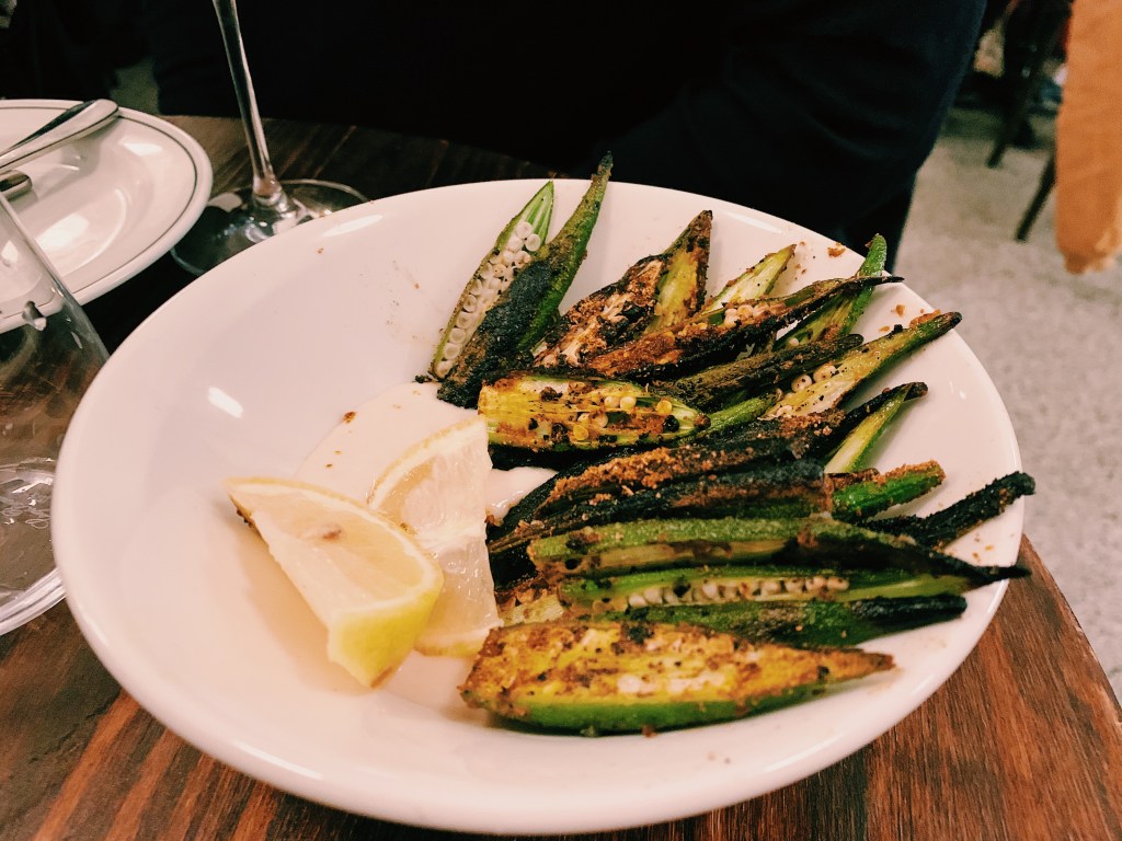 We couldn’t go past the blackened okra with spices ($14). The much-maligned okra is one of my favourite vegetables – whether it’s stewed in a curry, pan-fried with spices on the pan, or roasted until lightly charred. I grew up in Malaysia referring to it as ladies’ finger. Blackened okra is a popular side in the southern states of America, but okra is also prepared in a multitude of ways across South Asia, the Caribbean, West Africa and the Middle East.