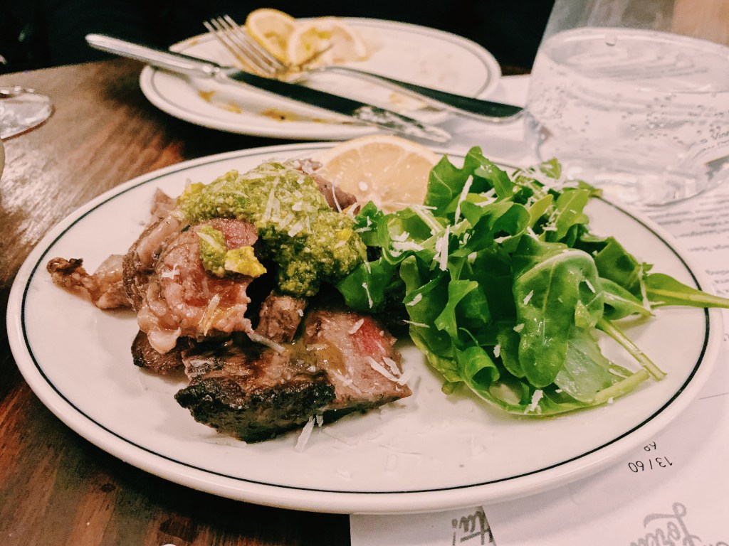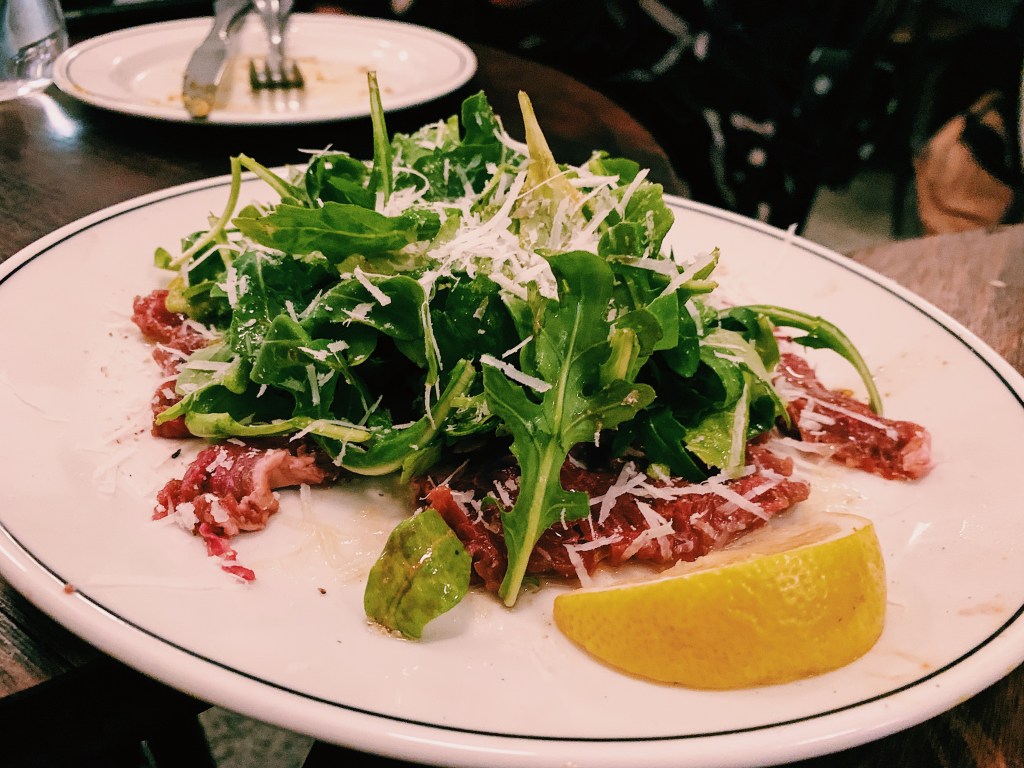 Branching out from our exclusively pescatarian night up to that point, we ordered the beef carpaccio with wild rocket, lemon, pecorino and truffle oil ($24). Conflicted Pescatarian didn’t partake – raw beef was a step too far into the omnivore’s camp. The thinly sliced raw beef was melt-in-your-mouth tender, with enough fresh vegetation in the rocket and enough tartness from the lemon to underline the dish’s fresh simplicity. Far from being its usual overwhelming self, the drizzle of truffle oil added a faint earthiness instead.