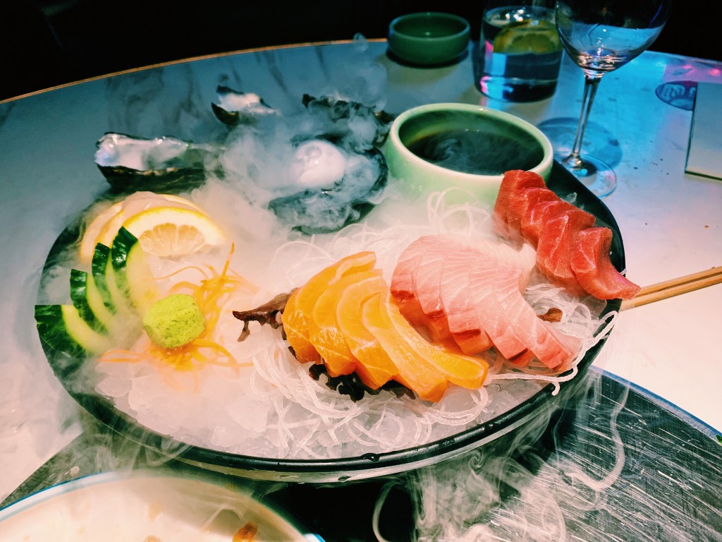 The platter itself arrived with much fanfare, shrouded in the theatrical vapour of dry ice. I benefited from siting sandwiched between Plant Whisperer, who has the magic touch with anything green, and Mr Beefcake – both weren’t much fans of sashimi, so I helped myself with careless abandon.