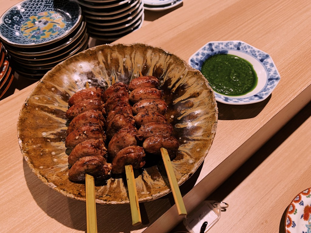 Next up were the chicken hearts with sansho pepper and spring onion sauce ($21 for three). I’m strictly a liver and gizzard girl when it comes to my offal consumption, but I greatly enjoyed these. To perhaps offset the gaminess of the hearts and in a departure from the minimalist condiments for the last few skewers, these came with a bitter, creamy spring onion sauce that we took the liberty of dipping a few of our different skewers into. Perfume Genius’s only comment was that she would’ve liked a more acidic accompaniment for the hearts.