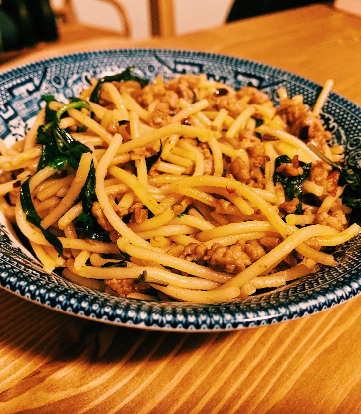 A traditional pad krapow is made with Thai basil but Pinch of This, Pinch of That uses sweet basil here, preferring the peppery clove-like aftertaste compared to the spicy anise-like notes of Thai basil.