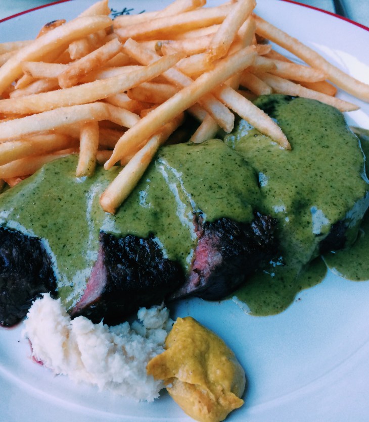 The steak frites at Entrecote comes with a “sauce Maison au beurre et aux herbes”, which post-meal sleuthing revealed was a “house sauce with butter and herbs” and what I’m sure was either a heap of garlic or onion or both, judging by how I felt after.